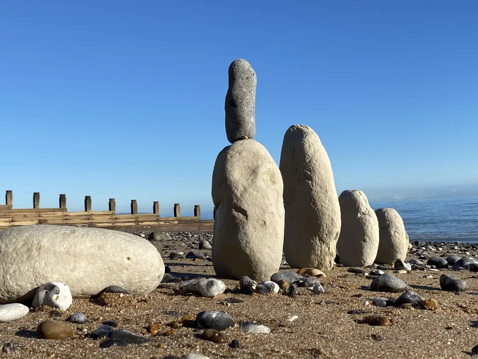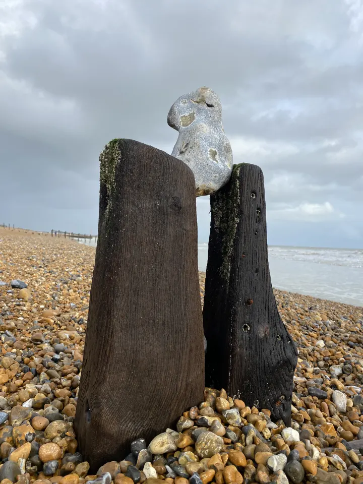 Balanced chalk and flint boulders on East Sussex beach