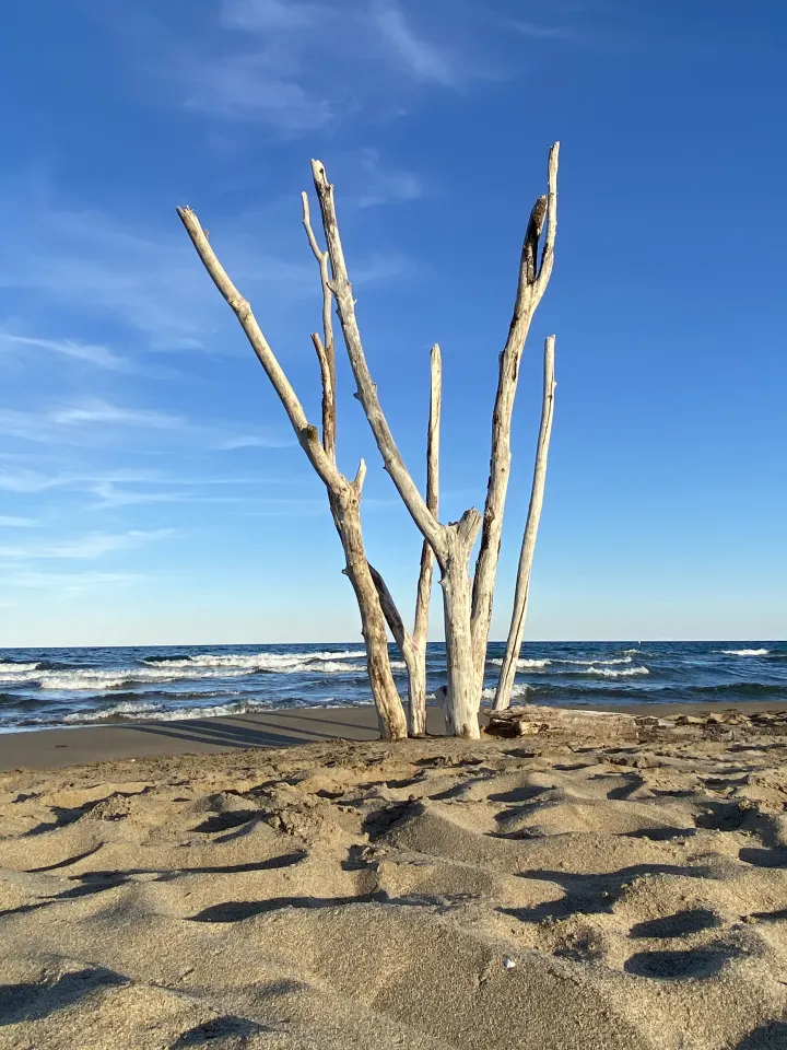 Collected driftwood branches from beach and reconnected them to form a stand of dead trees, giving them life once more.