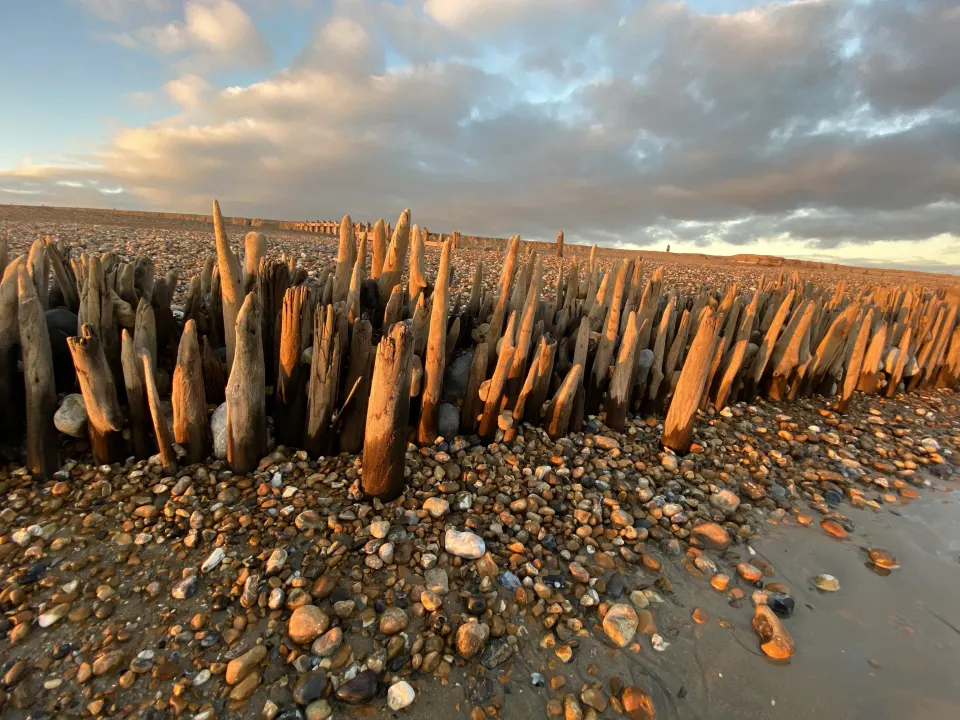East Sussex Timber Groyne with wedged flint waiting for rising tide to wash it away