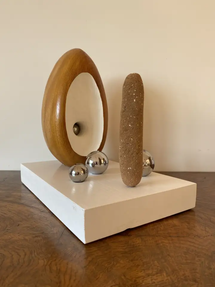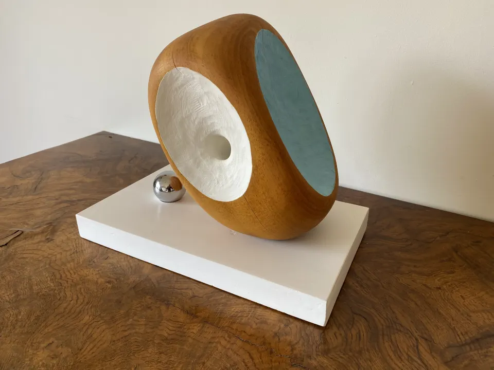 Iroko Hardwood, found mirrored spheres and cast plaster base
